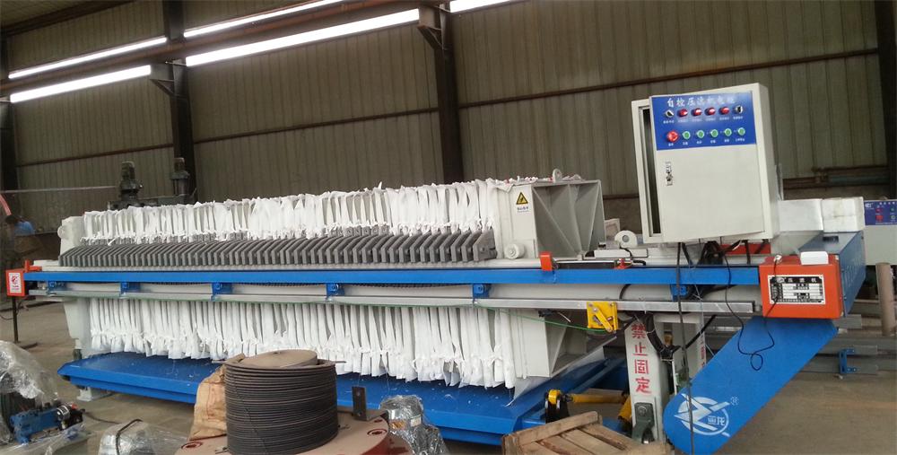 濾布單行走式自動廂式壓濾機工作時料漿從頂部進料口送入,經過進料、壓榨、洗滌、吹風干燥后,油缸啟動,將各濾室同時打開。濾布包著濾餅向下行走,濾餅很容易從濾布上卸除,同時高壓水對濾布進行清洗。整個過程能自動實現,大大節省了人力操作。
